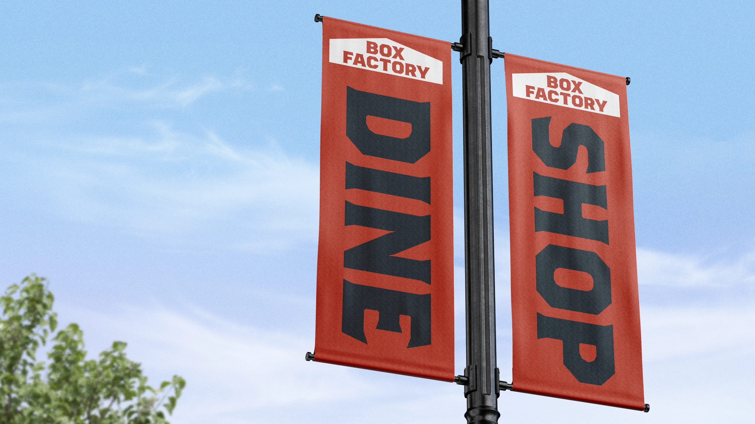 The Box Factory in the Old Mill District of Bend, Oregon was originally built in 1916 as part of the production facility of the Brooks-Scanlon Lumber Company to produce shipping boxes for a wide variety of goods—everything from fruits and vegetables to soaps, cereal, and even ammunition. Centrally located between the town center and the mountains in Bend; Killian Pacific recognized the potential benefit to the rapidly-growing Bend community and painstakingly restored the property as an eclectic destination of over 35 restaurants, shops and local businesses. The team at Killian Pacific tasked us with building a visual identity for the Box Factory that would celebrate the legacy of the Box Factory while supporting the diverse range of businesses that it showcases.